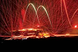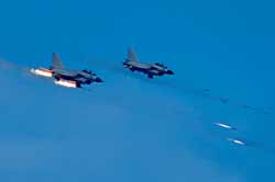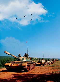 記者在演習(xí)現(xiàn)場(chǎng)看到,在某高地的爭(zhēng)奪戰(zhàn)中,紅藍(lán)雙方拼得異常激烈。拂曉剛過,“藍(lán)軍”15架飛機(jī)從多個(gè)方向同時(shí)出現(xiàn)在“紅軍”空域,準(zhǔn)備對(duì)“紅軍”目標(biāo)同時(shí)發(fā)起攻擊!凹t軍”毫不示弱,偵察飛機(jī)主動(dòng)出擊,出其不意地對(duì)敵情報(bào)預(yù)警系統(tǒng)實(shí)施欺騙性干擾,與此同時(shí),“紅軍”空中攔截兵力強(qiáng)行突防飛抵目標(biāo)上空,朝敵機(jī)猛撲過去,為奪取局部制空權(quán),與敵機(jī)展開了一場(chǎng)生死大戰(zhàn)。瞬間,方圓數(shù)百公里的戰(zhàn)場(chǎng)陡然升溫。爾后,“紅軍”空中轟炸機(jī)群多批次、多架次、不間斷對(duì)敵縱深目標(biāo)進(jìn)行持續(xù)轟炸,使敵指揮機(jī)構(gòu)、通信樞紐等重要目標(biāo)遭到癱瘓性打擊。