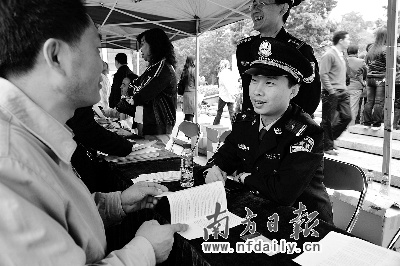 前來現(xiàn)場咨詢的群眾絡(luò)繹不絕。伍女士與丈夫帶著6歲的小孩一家子圍著現(xiàn)場的民警仔細(xì)地問。伍女士是江門臺山人,她1993年就來到廣州,在一家私人企業(yè)做工。工作了10多年,為了小孩讀書,勒緊了褲帶在越秀區(qū)文明路買了一套60多平方米的二手房,感覺自己多少有點像廣州人了。廣東即將推行居住證的消息讓她期待滿懷:“等了很久啊,現(xiàn)在看到了希望,有了戶口,才能真正讓自己在這里扎根下來啊!”