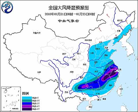 中央氣象臺(tái)1月21日06時(shí)發(fā)布寒潮藍(lán)色預(yù)警: