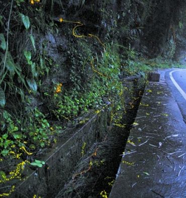 而在臥龍,付新華還發(fā)現(xiàn)了擁有33個發(fā)光器并同步發(fā)光的多光點螢,兩厘米長、圓筒形的體形、金黃的體色,翅膀完全退化。白天,她躲藏在土縫中躲避敵害。夜晚,她爬出土縫,身上33個發(fā)光器持續(xù)發(fā)出黃綠色的亮光,使捕食者不敢侵犯。其實她是在保護懷中的卵。