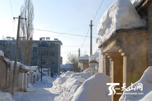 當(dāng)記者來到城區(qū)背街小巷——杜別克街道倉房巷時看到,兩旁的積雪已與過往行人一樣高。間距不過10米的巷道,一半已讓積雪擋住了去路。