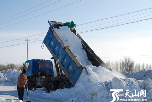 在塔城市,記者剛好碰到了一輛小四輪車裝滿了厚厚的雪向郊外倒雪點(diǎn)駛?cè)ァP∷妮嗆噺氖兄行牡挠押寐、新華路,又穿過3條街道,行了約10公里,在位于城西的經(jīng)濟(jì)開發(fā)合作區(qū)內(nèi)停了車。
