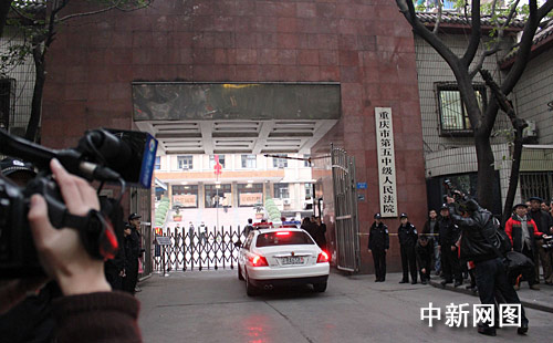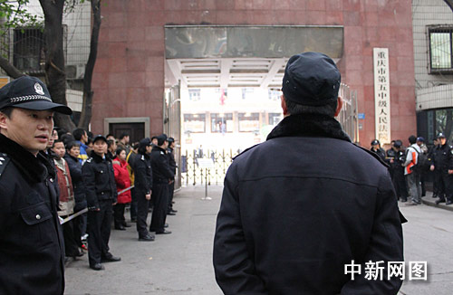 今天一早,中新網(wǎng)記者在重慶市第五中級(jí)人民法院門(mén)口看到,雖然法院門(mén)口沒(méi)有荷槍實(shí)彈的法警站崗,但法院周邊的警力布控比此前的打黑審判更為嚴(yán)密、警力更為密集,記者和旁觀者均禁止靠近法院大門(mén)。記者注意到,執(zhí)行任務(wù)的數(shù)十位警察均未佩戴警號(hào)。當(dāng)記者詢問(wèn)是否與今天受審對(duì)象有關(guān)時(shí),一警察以“不好說(shuō)”作答。