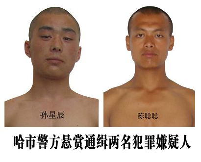 日前,哈爾濱市公安局面向社會懸賞通緝兩名犯罪嫌疑人,犯罪嫌疑人之一孫星辰,男,23歲,身高1.72米,長方臉,體態(tài)中等,東北口音,左臂有紋身(父母恩、永不忘等內(nèi)容),身穿黑色高領(lǐng)毛衣,藍(lán)綠色馬甲,黑色牛仔褲,布棉鞋;犯罪嫌疑人之二陳聰聰,男,21歲,身高1.72米,方臉大眼睛,厚嘴唇,東北口音,體態(tài)中等,身穿高領(lǐng)黑色羽絨服,前肩有兩側(cè)綠杠,灰色褲子,發(fā)紅色皮鞋。