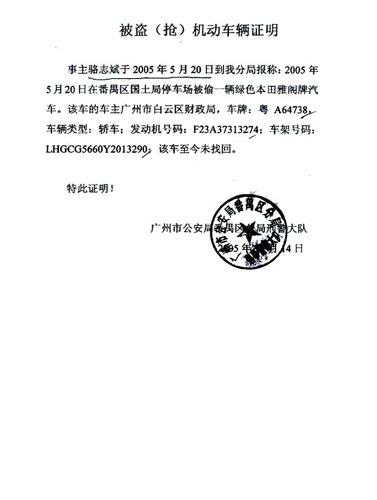 該博文還附了幾張文件的掃描圖作為證明。一張成交日期剛好是2005年5月20日的由番禺區(qū)國(guó)土房管局開(kāi)出的《契稅完稅證》,納稅人為“駱×”,房地產(chǎn)位置為錦繡香江花園××園×街×號(hào);一張六天后廣州市國(guó)土房管局開(kāi)出的同處房產(chǎn)的《房地產(chǎn)權(quán)情況證明》,權(quán)屬人為“駱×”,但備注注明共有人為韓××及駱志斌;一張廣州市公安局番禺分局刑警大隊(duì)開(kāi)出的《被盜(搶)機(jī)動(dòng)車輛證明》(見(jiàn)左圖),上寫(xiě)駱志斌于2005年5月20日到該分局報(bào)案稱,本田雅閣汽車當(dāng)天在番禺區(qū)國(guó)土局停車場(chǎng)被盜。網(wǎng)友注明,“駱×”為駱志斌的公子。另外,網(wǎng)友還附了一張房產(chǎn)圖片,稱錦繡香江花園同樣位置的別墅在2006年已賣到每平方米3萬(wàn)元。