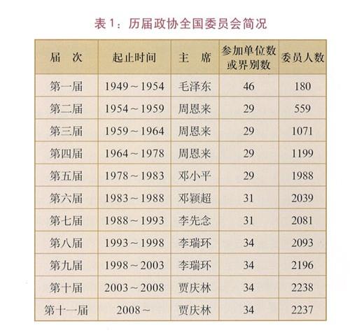 政協(xié)全國(guó)委員會(huì)每屆任期五年,設(shè)主席、副主席若干人、秘書長(zhǎng)。歷屆政協(xié)全國(guó)委員會(huì)簡(jiǎn)況如表1。