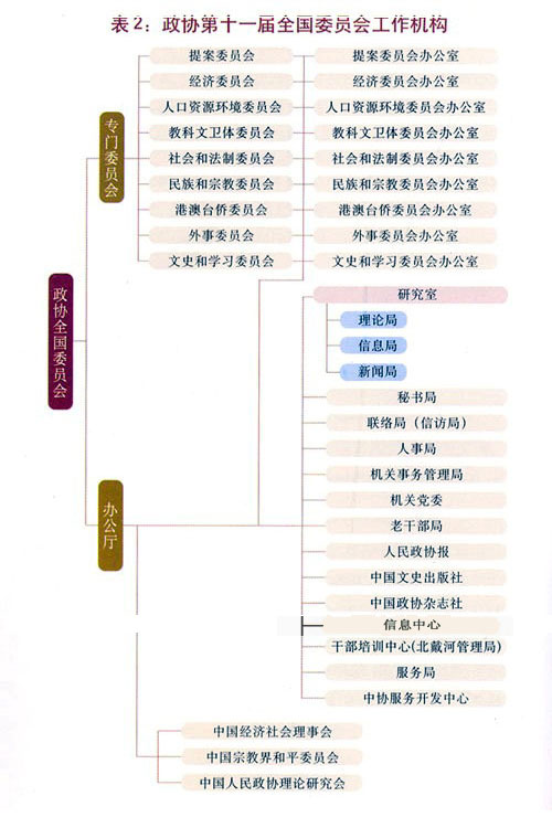全國委員會設(shè)辦公廳,在秘書長領(lǐng)導(dǎo)下進行工作;設(shè)副秘書長若干人,協(xié)助秘書長進行工作。政協(xié)第十一屆全國委員會工作機構(gòu)如表2。