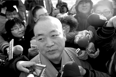 每次人大代表“走紅地毯”時,圓臉方耳、身穿黃色袈裟、足蹬黑色布鞋的全國人大代表、少林寺方丈釋永信一出現(xiàn)在廣場上就會被記者團團包圍,“方丈,聽說你開越野車”“方丈,你現(xiàn)在是住在大別墅了吧?”……面對大家拋出的各種問題,他不急不惱,邊低聲念“阿彌陀佛”邊試圖向密不透風(fēng)的人墻外移動。見叱咤少林寺的大師卻被眾人圍堵得步履維艱,好事者喊了句“大師,用輕功啊”!大師就是大師,面對記者們刁鉆的問題,他往往用微笑代替回答,“我知道,就算我不說話,也會成為新聞”。