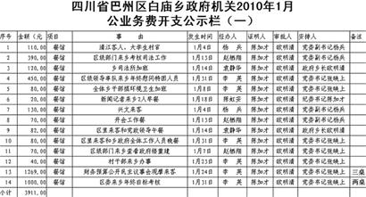 帖子內(nèi)名為《四川省巴州區(qū)白廟鄉(xiāng)政府機關(guān)2010年1月公業(yè)務(wù)費開支公示》的表格顯示,1月份,鄉(xiāng)政府支出公業(yè)務(wù)費44筆,共8240.5元,其中最大的一筆開支是,1月24日招待“財務(wù)預(yù)算公開民主議事會觀摩來客”,請客三桌,花費1269元,最小的一筆開支僅為“購買信紙”,花費1.5元。