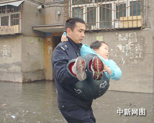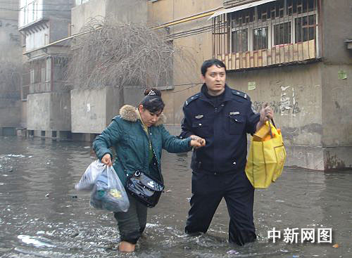 大量的融雪性洪水向倉房溝村一帶低洼處涌積,致使土柸結(jié)構(gòu)的居民住房被洪水浸泡,有垮塌之險(xiǎn)。另一處的大量洪水涌入近處一棟居民樓,民警立即組織警力進(jìn)入樓內(nèi)進(jìn)行施救,挨家挨戶動(dòng)員居民撤離住所,并攜老扶幼將婦女兒童帶離危險(xiǎn)地帶。