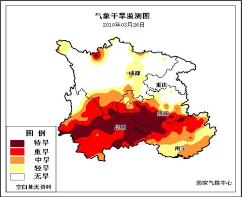 3月26日氣象干旱監(jiān)測(cè)顯示,云南大部、貴州西部和南部、廣西西部和北部、川西高原南部等地存在中度以上氣象干旱;其中云南大部、貴州西南部、廣西西北部、川西高原南部等地存在重度以上氣象干旱。