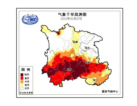 根據(jù)3月27日監(jiān)測(cè),云南大部、貴州西南部、廣西西北部、川西高原南部等地存在重度以上氣象干旱。
