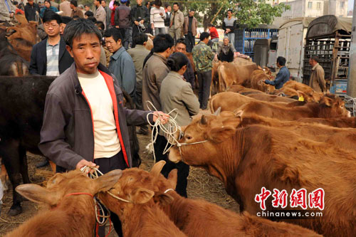 秦大章夫婦看上了馮元達一頭不到兩歲的小牛,“沒換牙齒、蹄也不錯。”秦大章很內(nèi)行的告訴記者。在此后近30分鐘的時間里,一場在2300元至1900元人民幣之間的價錢拉鋸戰(zhàn)進行起來。最終,在周邊人的撮合下,秦大章以2010元的價錢買到了他看上的小牛。