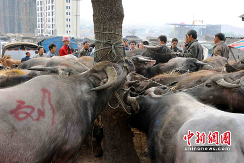 近中午時間,市場里買賣的人群還未散去。秦大章夫婦牽著剛買的;丶伊耍@得花上2、3個小時的時間。回到家,喂牛的水又是一個問題,“沒干凈水夠它喝,只能像鄰居那樣把洗菜、洗臉腳的水留下給牛喝。”秦大章的妻子說。雖然羨慕村里有人可以用機器耕地,但家里的4、5畝地多在石頭叢生的半山腰上,秦家夫婦還是只能選擇最傳統(tǒng)的牛耕方式。