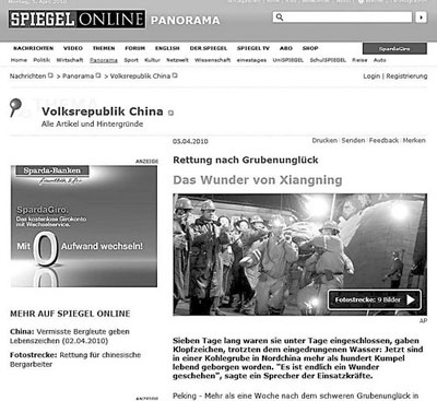 德國《明鏡》周刊網(wǎng)絡(luò)版以“鄉(xiāng)寧的奇跡”為題,報(bào)道了山西省臨汾市鄉(xiāng)寧縣王家?guī)X煤礦115名礦工成功升井的壯舉。報(bào)道說:“3000多名救援人員在過去的幾天里夜以繼日地不間斷救援。為了不讓自己因疲憊倒下,他們將自己用皮帶固定在坑道壁上,渴了就喝坑道冒出來的水!钡赂鞔竺襟w網(wǎng)絡(luò)版在刊登該消息時(shí)全部引用了擔(dān)任中國政府礦山安全顧問的專家大衛(wèi)·費(fèi)克爾特的話:“這是礦業(yè)歷史上的一次最令人驚嘆的援救行動(dòng)!”