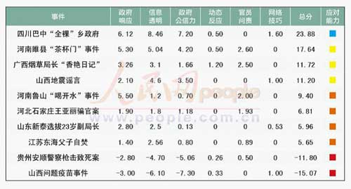 人民網(wǎng)輿情監(jiān)測(cè)室今天發(fā)布了“2010年第一季度地方應(yīng)對(duì)網(wǎng)絡(luò)輿情能力排行榜”,對(duì)2010年第一季度地方黨政機(jī)關(guān)應(yīng)對(duì)輿情熱點(diǎn)事件的得失進(jìn)行考評(píng)。四川巴中“全裸”鄉(xiāng)政府因?yàn)樵谛畔⑼该鞫取⒄帕Φ戎笜?biāo)上一枝獨(dú)秀,進(jìn)入總體較為得體的藍(lán)色區(qū)域,而貴州安順警察槍擊致死案、山西問(wèn)題疫苗事件則被判定為應(yīng)對(duì)嚴(yán)重失當(dāng),被亮起“紅色警報(bào)”,值得反思。中國(guó)人民大學(xué)公共政策研究院執(zhí)行副院長(zhǎng)毛壽龍教授在點(diǎn)評(píng)山西疫苗事件時(shí)就指出“問(wèn)題一個(gè)系統(tǒng)又一個(gè)系統(tǒng)的出,再一個(gè)系統(tǒng)一個(gè)系統(tǒng)地去治理,顯然不是一個(gè)好辦法。所以,現(xiàn)在是各個(gè)領(lǐng)域都需要很好重視的時(shí)候了”。