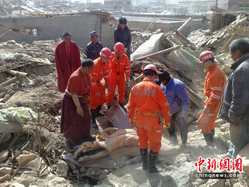 救援隊(duì)到達(dá)后玉樹縣后,首先趕到結(jié)古鎮(zhèn)“玉樹州綜合民族職業(yè)學(xué)!笨逅F(xiàn)場,并立即展開搜救。據(jù)了解,該職業(yè)中學(xué)的三層電教樓全部垮塌,下面還有10余名學(xué)生被埋。什邡市安全生產(chǎn)應(yīng)急救援大隊(duì)搶險(xiǎn)隊(duì)員運(yùn)用專業(yè)工具馬上進(jìn)行施救。經(jīng)過一夜緊張救援,被埋壓在職業(yè)學(xué)校電教大樓下的6名學(xué)生遺體被挖出,搜救仍在繼續(xù)。