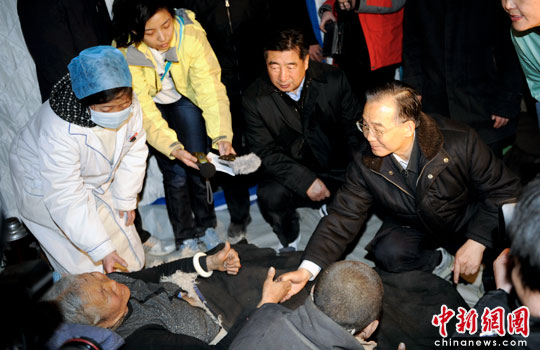 4月15日20時(shí),中國國務(wù)院總理溫家寶來到青海省玉樹縣玉樹自治州醫(yī)院看望受災(zāi)民眾。中新社發(fā) 廖攀 攝