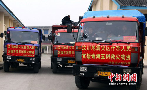 中新網(wǎng)什邡4月16日電(記者楊杰)16日上午,首批3輛滿載著代表“5.12”地震極重災(zāi)區(qū)什邡人民深情厚誼的捐贈救災(zāi)物資車輛,從什邡市啟程,開始奔赴青海玉樹災(zāi)區(qū)。