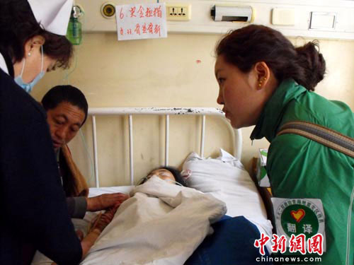 在來自玉樹縣的33歲的央金拉措床前,西北民族大學(xué)2009級藏語言文學(xué)自考班的學(xué)生更求拉吉,自15日晚起,成為“救治青海地震災(zāi)區(qū)傷員翻譯”志愿者,她跑前跑后的為傷者服務(wù),央金拉措的哥哥用簡單的漢語對記者連聲說,好、好!記者通過更求拉吉了解到,央金拉措他們來自于牧區(qū)很少去醫(yī)院,昨晚一住進醫(yī)院后就暈頭轉(zhuǎn)向了,幸虧有大學(xué)生志愿者為他們提供幫助。(完)