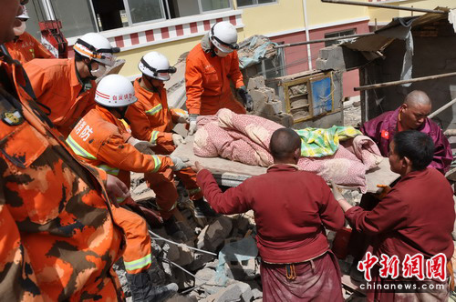 中新網(wǎng)成都4月17日電(肖洪環(huán))4月16日,玉樹7.1級地震救援進(jìn)入第三天,也是“黃金72小時(shí)”的關(guān)鍵時(shí)機(jī),四川消防鐵軍官兵按照溫家寶總理的指示,堅(jiān)持“救人第一”的原則,利用生命探測儀、搜救犬和“喊、聽、問、看”等方式在廢墟下努力搜尋幸存者,不放過任何一個(gè)角落,不放棄任何一絲希望,全力以赴救援,展開了生命大營救,尤其是在縣城扎西巷一個(gè)居民樓救援現(xiàn)場發(fā)生的那一幕幕感人致深的場景,讓人們繼“5.12”以來再一次次地感受到人間最偉大的“母愛”,以及救援人員對生命、對逝者、對民族的尊重,在難救援現(xiàn)場處處彰顯出“災(zāi)難無情、人間有情”的“大愛”。