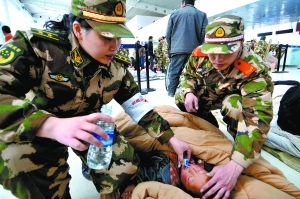 只要有傷員,羅愛華和戰(zhàn)友就用肩扛、用手抬,將傷者抬進大廳輸液、包扎……等待專機到來。13時50分,一名重傷女孩被醫(yī)療隊從車上接到候機大廳。羅愛華看到女孩因缺水嘴唇干裂、臉發(fā)青。她立即拿來礦泉水,一口一口喂到女孩嘴里。可能是太長時間沒喝水,女孩一口氣連喝十幾口。喝了近半瓶水后,女孩臉色開始好轉(zhuǎn),并用感激的眼神打量這位阿姨。這時,接傷員的專機到達,女孩被抬上飛機。