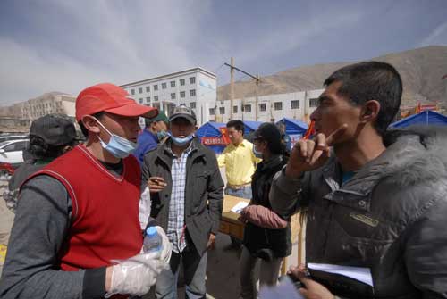 他的名字叫高樹友。在現(xiàn)場負(fù)責(zé)招募志愿者的玉樹團(tuán)州委干事扎西告訴我,地震發(fā)生后幾小時,滿身是土的高樹友跑來了,找到我們要求當(dāng)志愿者。“當(dāng)時現(xiàn)場還很亂,我們隨便找了一張紙,高樹友寫下了第一個名字”,扎西從桌上拿出一個寫滿名字的紙說:“就是這樣的紙,現(xiàn)在已經(jīng)寫滿幾十頁,有400多人報名了,地震當(dāng)天有30多個。高樹友不僅是第一個報名,而且?guī)椭覀兘M織志愿者,這個招募點就是我們一起搭起來的。”