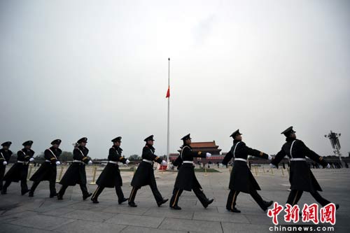 這是天安門前的國(guó)旗第二次為哀悼普通公民的生命隕落而降。兩年前的5月19日,這里也曾下半旗,向汶川大地震遇難者致哀。