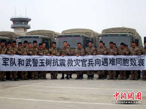 中新網(wǎng)4月21日電(劉洪星)今日,玉樹災(zāi)區(qū)巴塘機(jī)場(chǎng)武警青海總隊(duì)第四支隊(duì)全體官兵、全體解放軍部隊(duì)、醫(yī)療單位、機(jī)場(chǎng)工作人員以及其他救援人員在候機(jī)樓前停車場(chǎng)舉行三分鐘默哀活動(dòng),現(xiàn)場(chǎng)降半旗,所有人員駐足默哀、所有車輛鳴笛、防空警報(bào)響起。同時(shí)玉樹州所有救援部隊(duì)、救援單位、各級(jí)人員同期舉行為地震死難人員默哀活動(dòng)。