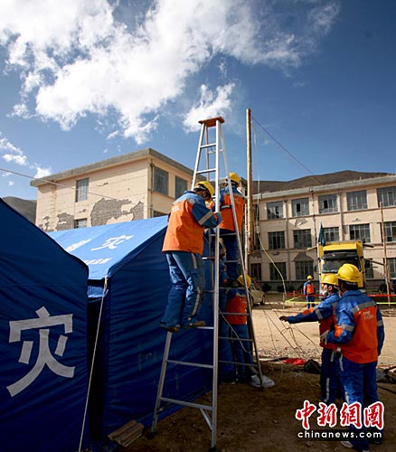 20日8:00許,玉樹抗震救災(zāi)指揮部要求:盡快恢復(fù)玉樹州紅旗小學(xué)的供電。軍令如山,四川電力抗震救災(zāi)指揮長(zhǎng)袁邦亮率隊(duì)前往紅旗小學(xué)查勘現(xiàn)場(chǎng)。一踏進(jìn)校門,迎面一幢教學(xué)大樓裂痕斑斑,仿佛隨時(shí)都有坍塌可能,汶川地震教學(xué)樓倒塌的例子讓隊(duì)員們心頭一沉,穿過主教學(xué)樓,其他幾幢樓或傾斜或裂口或墻體脫落,但都還頑強(qiáng)站立,隊(duì)員們長(zhǎng)出了一口氣。