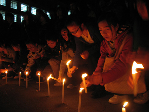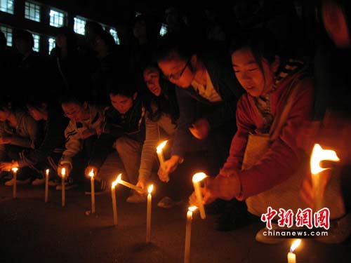 中新網(wǎng)烏魯木齊4月22日電(冀江彤)21號晚間10時,新疆大學近3000名學子,點燃燭光,俯首致哀,表達對玉樹地震遇難者的哀思;顒咏Y(jié)束后,仍有許多學生手捧燭光,不愿離去,為玉樹人民祈福加油。