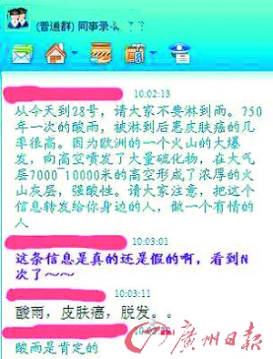 對(duì)于網(wǎng)絡(luò)和手機(jī)上瘋傳的“火山灰?guī)?lái)750年一次的酸雨”,廣西、湖南等地氣象部門(mén)都已緊急辟謠。廣東省氣象局也提出昨天廣東降雨P(guān)H值正常,未受火山灰影響。
