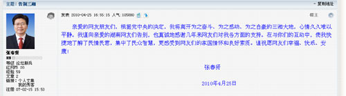 張春賢在帖中說:親愛的網(wǎng)友朋友們,根據(jù)黨中央的決定,我將離開為之奮斗、為之感動(dòng)、為之自豪的三湘大地,心情久久難以平靜。我謹(jǐn)向親愛的湖南網(wǎng)友們告別,也真誠地感謝幾年來網(wǎng)友們對我各方面的支持。在與你們的互動(dòng)中,使我快捷地了解了民情民意,集中了民眾智慧,更感受到網(wǎng)友們的家國情懷和良好素質(zhì)。謹(jǐn)祝愿網(wǎng)友們幸福、快樂、安康!