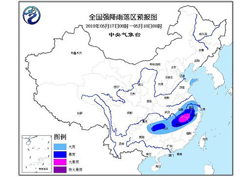 中新網(wǎng)5月17日電 中央氣象臺17日06時繼續(xù)發(fā)布暴雨藍色預警:預計,17日08時到18日08時,湖北東部、安徽中南部、江蘇中南部、浙江中西部、江西中北部、湖南中北部、貴州東北部及山東半島等地有大到暴雨。