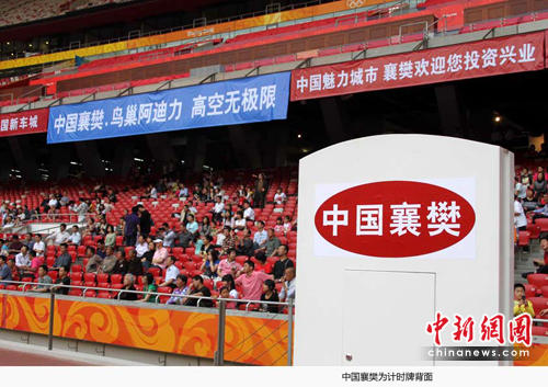 目前,襄樊市已在鳥巢體育場外圍懸掛236面宣傳襄樊形象的廣告彩旗,場內(nèi)懸掛巨幅宣傳標(biāo)語20幅,在阿迪力居住的小屋三面噴繪襄樊古城風(fēng)貌、古隆中、汽車城等內(nèi)容的宣傳片。下一步,還將在鳥巢內(nèi)舉辦襄樊日等活動,以提高襄樊知名度,提升襄樊形象。