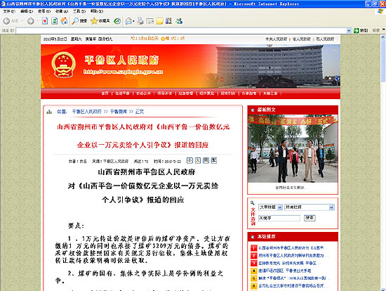 山西省朔州市平魯區(qū)人民政府對(duì)《山西平魯一價(jià)值數(shù)億元企業(yè)以一萬(wàn)元賣(mài)給個(gè)人引爭(zhēng)議》報(bào)道的回應(yīng)