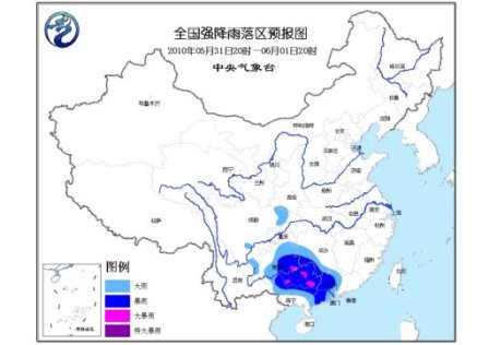 中新網(wǎng)5月31日電 中央氣象臺今日18時發(fā)布暴雨藍色預(yù)警:預(yù)計5月31日20時到6月1日20時,貴州中東部和南部、湖南西南部、廣西中北部、廣東中西部等地有大到暴雨,其中貴州東南部、廣西中北部等地的局部地區(qū)有大暴雨;上述部分地區(qū)還將伴有短時雷雨大風等強對流天氣。另外,四川盆地東北部、云南東北部等地的部分地區(qū)有大雨。