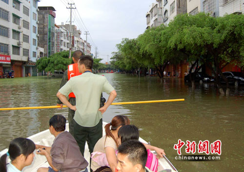 記者在來賓市實驗中學(xué)看到,該校已成為一片湖泊。水深處約有1.6米,已經(jīng)淹過成年男子肩膀。水中七零八落飄散著住戶的生活用品,一樓居民已經(jīng)全部撤離。消防官兵自早上8時許開始對被困師生進(jìn)行救援,直至下午5時,該校1100名被困師生及家屬全部撤至安全地帶。學(xué)校內(nèi)停電并且無法出行,影響了不少居民的正常生活。周邊幾家商鋪圍擋自家門口防止積水流進(jìn)店內(nèi),用各種器皿向外倒水。