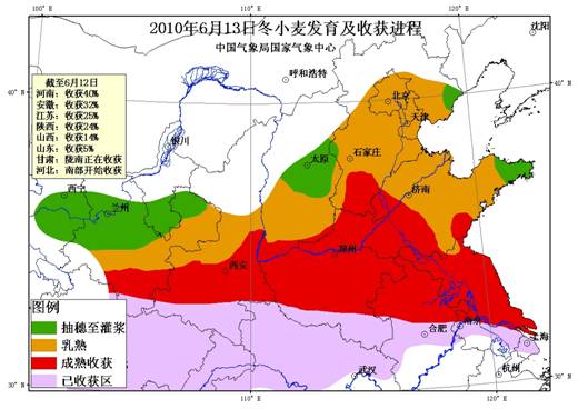 目前,安徽中北部、江蘇大部、河南中北部、陜西南部和關中、甘肅隴南、山西西南部、山東西部和南部、河北南部、新疆西南部冬小麥處于成熟收獲期;山東中東部、河北大部、山西南部、陜西中北部、甘肅隴東大部、新疆南部偏東地區(qū)冬小麥處于乳熟期;山東半島東部、河北東北部、山西中部、甘肅隴中和隴東西北部、新疆北部冬小麥處于抽穗至灌漿階段。