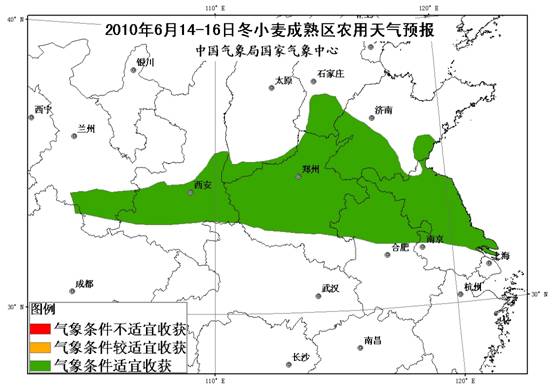 預計6月14-16日,陜西南部和關中、山西西南部、河北南部、河南中北部、山東西部和南部、安徽中北部和江蘇麥收區(qū)以晴到多云天氣為主,適宜冬小麥收獲晾曬和夏播作物播種。