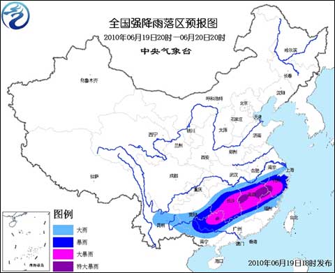 中央氣象臺2010年6月19日18時繼續(xù)發(fā)布暴雨橙色預(yù)警: