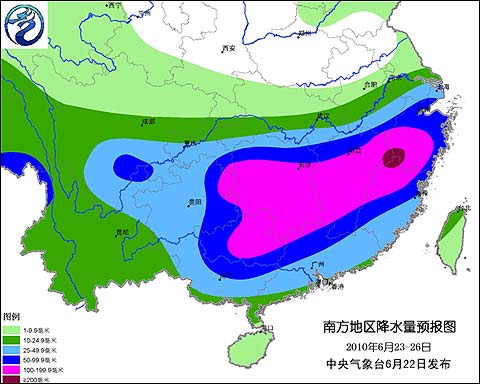 預(yù)計23日至26日,江淮、江南、華南大部以及西南地區(qū)東部等地又將出現(xiàn)一次強降雨過程。貴州東部、湖南、江西、浙江、福建、廣西、廣東北部有大到暴雨,局部地區(qū)有大暴雨,并將伴有短時雷雨大風(fēng)等強對流天氣;過程降雨量有50-120毫米,局部地區(qū)可達(dá)150-260毫米。湖南、江西、福建、廣西等地的汛情將進(jìn)一步發(fā)展,建議各地、各有關(guān)部門及時采取措施,加強防范區(qū)域性洪澇災(zāi)害和嚴(yán)重次生災(zāi)害。