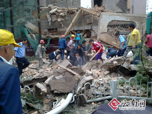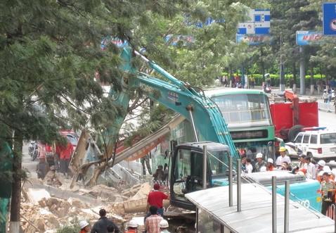 記者現(xiàn)場了解到,今天上午11時15分左右,云南飯店在拆遷過程中突然發(fā)生倒塌。靠東風(fēng)西路一邊正在被拆遷的一堵高大約7米的墻體砸向公交站臺,一輛5路公交車正在站臺上下客,由于墻體離公交站臺非常近,正在下車的兩名乘客(一男一女)被砸傷。隨后,救護(hù)車迅速趕往現(xiàn)場,目前,兩名傷者均已被送往醫(yī)院搶救,傷勢尚不清楚。