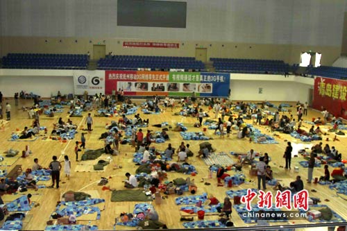 體育館內(nèi)鋪滿了被褥、涼席,有些老人和小孩還正在睡覺(jué)。有的床位已經(jīng)空出來(lái),工作人員介紹,這些人大多轉(zhuǎn)投親友去了。記者發(fā)現(xiàn),盡管體育館內(nèi)人很多,但一點(diǎn)也不嘈雜,很多人就躺在被子上,靜靜地望著十幾米高的天花板。