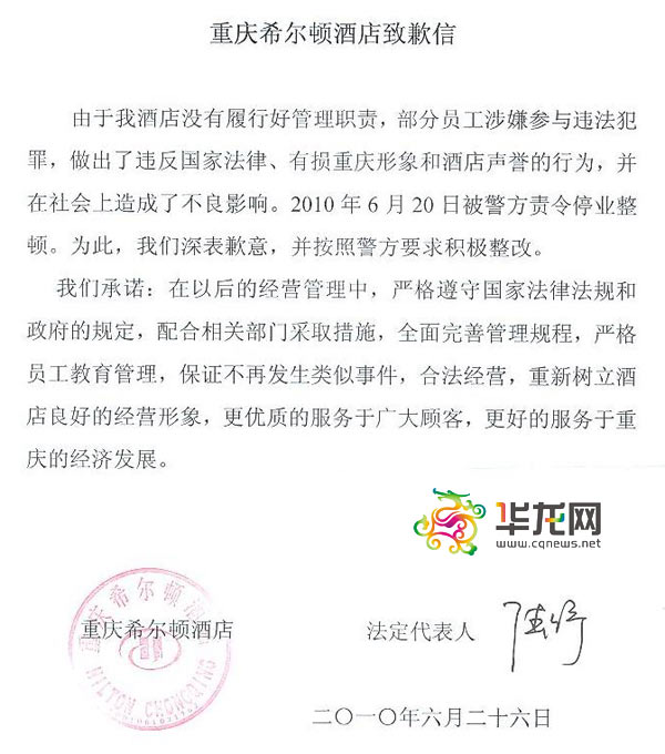 陸紓在致歉信中稱,由于酒店沒有履行好管理職責(zé),部分員工涉嫌參與違法犯罪,做出了違反國家法律、有損重慶形象和希爾頓酒店聲譽(yù)的行為,并在社會上造成了不良影響,6月20日酒店被警方責(zé)令停業(yè)整頓!皩Υ,我們深表歉意,并按照警方要求積極整改。”