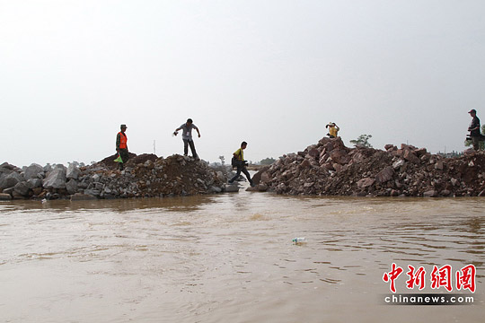 下午4點左右,數(shù)米長的小口子,已經(jīng)被接連倒下的七八卡車石料填成數(shù)十厘米寬的“裂縫”,由于大壩堤外水位比撫河水位高,洪水從堤外往河內(nèi)倒流,剩下的最后“裂痕”就像一條涓涓細流,不少人在上面來回走動,幾天來難以跨越的決口,終于連在了一起。