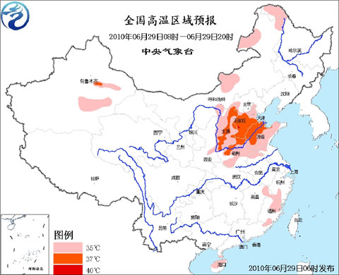 中新網(wǎng)6月29日電 中央氣象臺29日06時繼續(xù)發(fā)布高溫藍色預警:預計,今天白天,內(nèi)蒙古東北部和中部的部分地區(qū)、黑龍江西北部、山西大部、河北大部、天津、河南大部、山東大部、安徽北部、江蘇西北部、福建北部和南部的部分地區(qū)、江西東北部的部分地區(qū)、海南北部等地有35~37℃、部分地區(qū)38℃的高溫天氣,其中,河北南部的局部地區(qū)氣溫可達40℃。