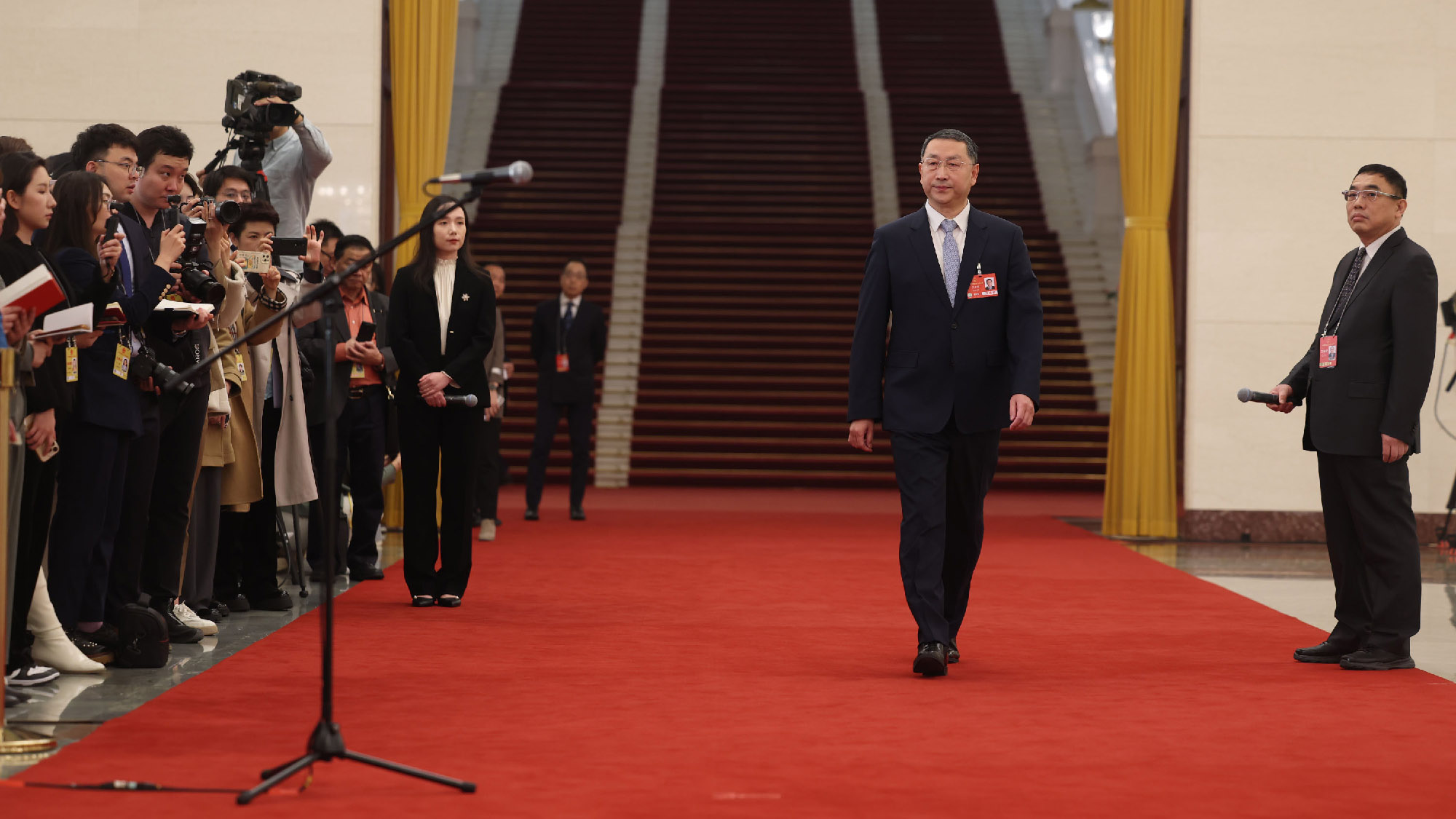 3月11日下午閉幕會后,在人民大會堂北大廳舉行十四屆全國人大三次會議第三場“部長通道”集中采訪活動,邀請部分列席會議的國務院有關部委主要負責人接受采訪。