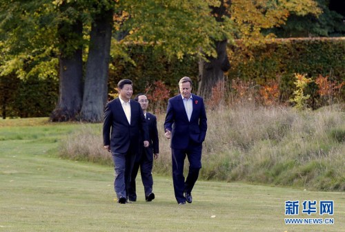 10月22日,國家主席習(xí)近平在契克斯首相鄉(xiāng)間別墅同英國首相卡梅倫再次會晤。這是習(xí)近平與卡梅倫漫步草坪,邊走邊談。 新華社記者 鞠鵬 攝 圖片來源:新華網(wǎng)