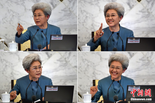 3月4日,大會發(fā)言人傅瑩就大會議程和人大工作相關(guān)問題回答中外記者的提問。(拼版圖片) 中新社記者 金碩 攝